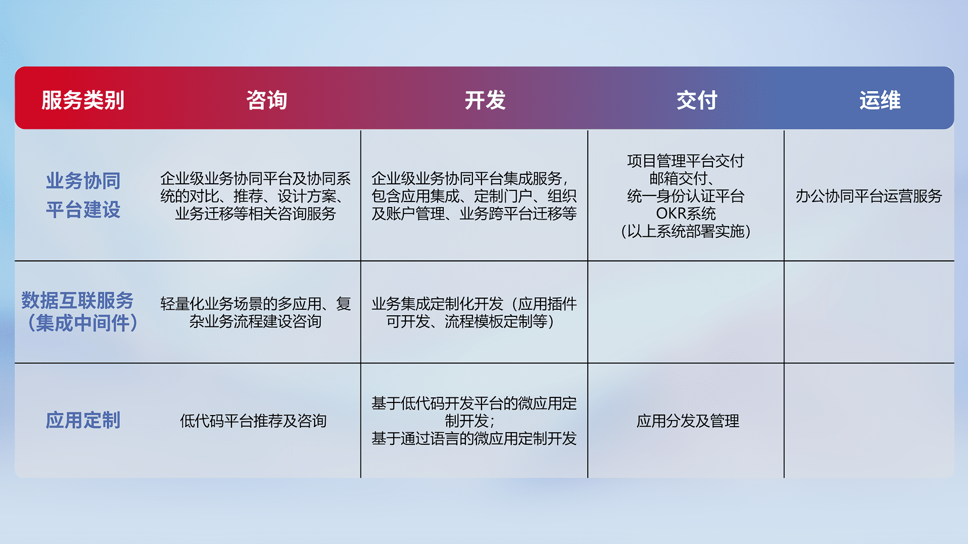 针对钉钉、、企微、、、IDaas等平台级产品提供产品的规划、、、、方案、、、交付、、、定制化开发等服务,,,,实现如统一协同办公、、智能客户服务、、、、混合会议管理、、智能数据查询、、、、等业务场景,,,实现数字化转型。。。