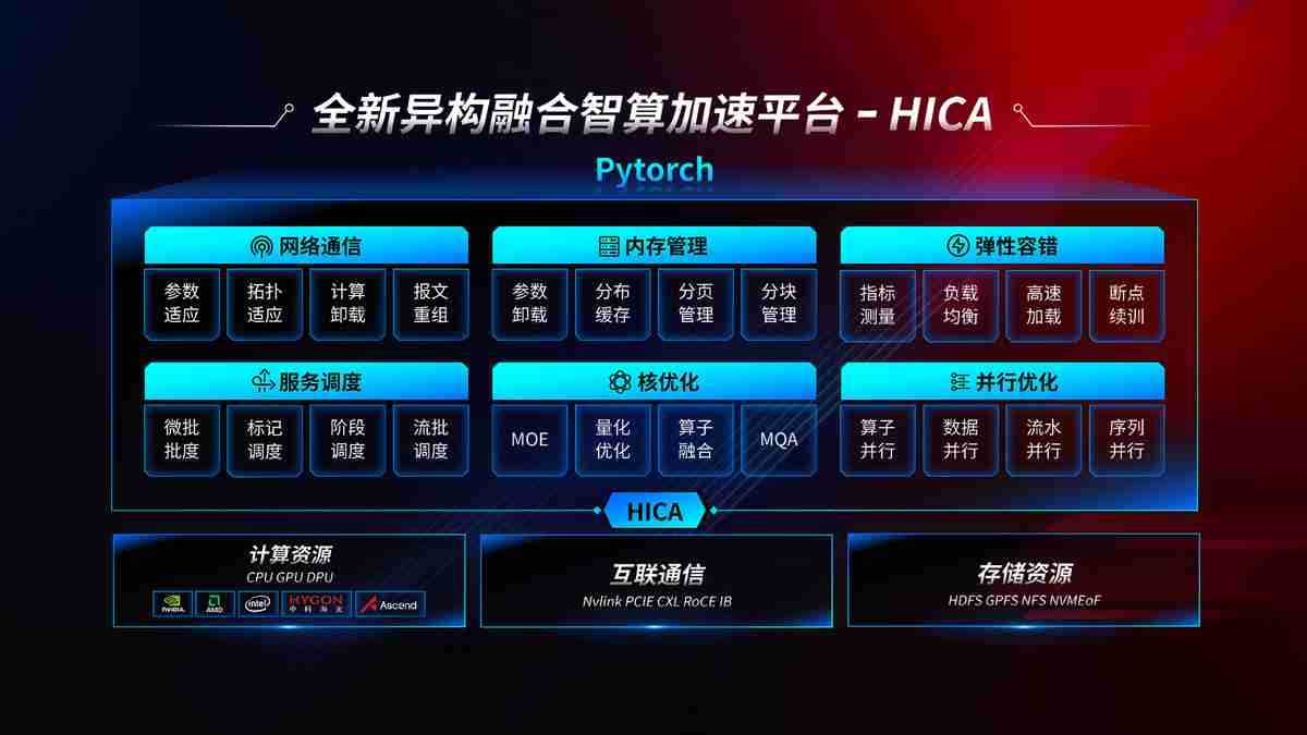 通过自研的服务层、、、中间适配层、、、以及调度编排算法,,,,采用数据并行、、、模型并行等多种并行方式,,,把并行计算任务进行有效的分解,,,使其分别由相应的软件栈和算力资源来承接。。。。当GPU资源变化,,,,HICA可以实时动态调度计算子任务并调整模型拓扑和架构,,以充分聚合各种算力资源。。