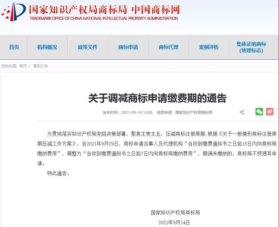 近日,,,,中国商标网发布关于调减商标申请缴费期的通告。。。通告指出,,,,自2021年9月29日,,商标申请当事人及代理机构“自收到缴费通知书之日起15日内向商标局缴纳费用”,,调整为“自收到缴费通知书之日起7日内向商标局缴纳费用”,,,,期满未缴纳的,,,商标局不受理其申请。。。